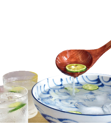 大きい鉢(どんぶり)に氷をいっぱい入れます。そこにすだち酎を注ぎます。お玉ですくってグラスに移します。すだちのスライスを浮かべると香りがさらに広がります。