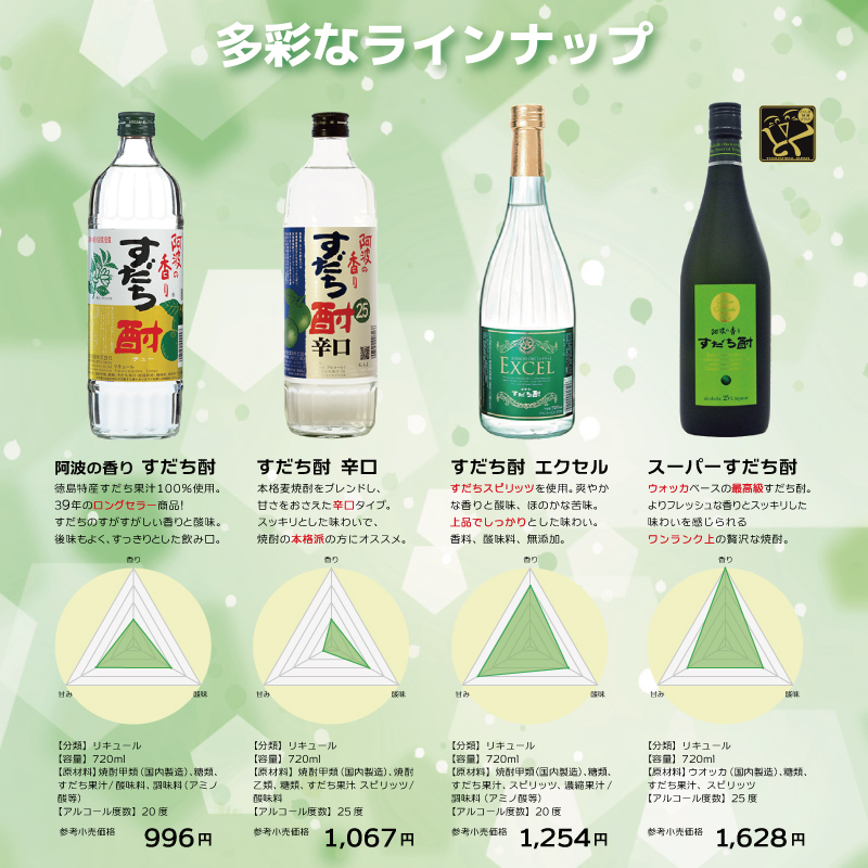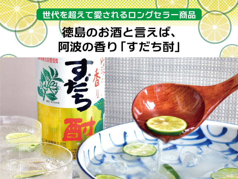 「すだち」は徳島県を代表する特産物のひとつで、香酸かんきつ類です。「すだち酎」は一番香りが良いといわれる8月下旬から9月下旬に収穫される、露地物の天然すだち果汁だけを使用しています。